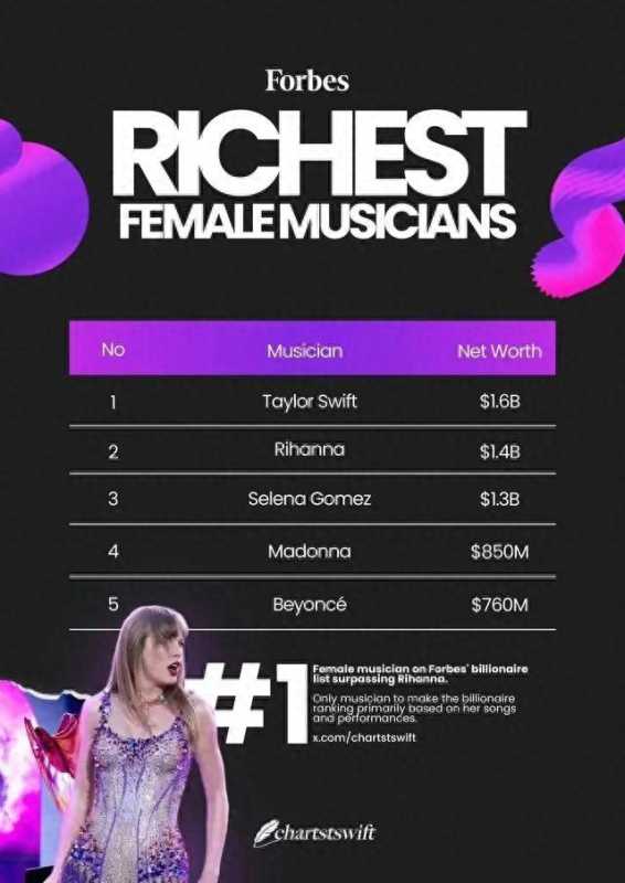 据福布斯数据统计,10月5日,美国女歌手“霉霉”泰勒·斯威夫特净资产上涨至16亿美元,约合人民币112亿元,成为历史上最富有的女歌手,也是唯一一位仅凭歌曲和表演跻身亿万富翁榜单的音乐家。