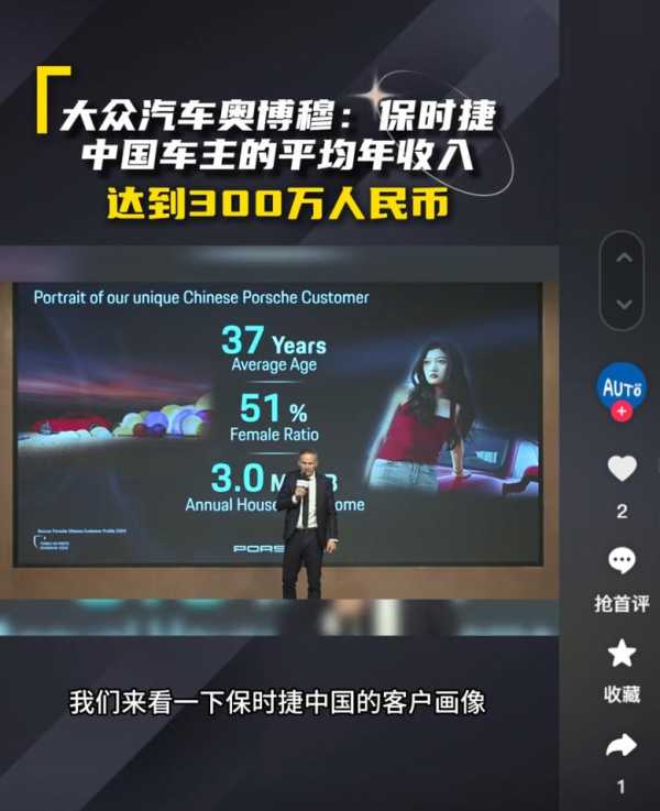 据经观汽车报道,奥博穆在谈到保时捷在中国市场发展现状时透露,保时捷的中国客户平均年龄只有 37 岁,而且 51% 的车主为女性车主,保时捷中国车主的家庭平均年收入达到 300 万元。