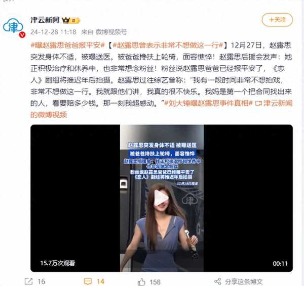 12月27日,赵露思突发身体不适,被曝送医。被爸爸搀扶上轮椅,面容憔悴!赵露思后援会发声:她正积极治疗和休养中,也非常想念粉丝!粉丝说赵露思爸爸已经报平安了,《恋人》剧组将推迟年后拍摄。赵露思过往综艺曾称:“我有一段时间非常不想拍戏,非常不想做这一行。我就跟他们讲,我真的很不快乐。我妈是第一个把合同找出来的人,看要赔多少钱。那一刻我超感动。”