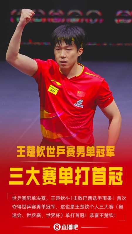 直播吧05月25日讯 世乒赛男单决赛,王楚钦复仇雨果首次夺得世乒赛男单冠军,这也是王楚钦个人三大赛(奥运会、世乒赛、世界杯)单打首冠!