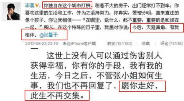 和张馨予恋爱时轰轰烈烈,几乎全网皆知,李晨对张馨予告白,今后天涯海角有我相伴,谁知就在两人见家长谈婚论嫁时,李晨又爱上了身材颜值更高的范丞丞的姐姐。还为了她和张馨予彻底反目,称自己和张馨予此生不再交集,向范丞丞姐姐表决心。