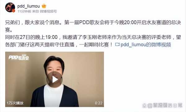 PDD下午更新个人微博,宣布第一届PDD歌友会决赛将邀请李玉刚老师担任评委。