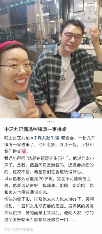 此外,从偶遇者的叙述中可以得知,钟镇涛在吃饭期间还和其愉快畅聊,夸赞其很会挑吃的,选的这家餐馆很不错,在此过程中,钟镇涛流利使用普通话与该网友透露,该网友也表示,钟镇涛与家人之间同样用普通话交流。