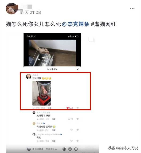 据了解,“杰克辣条”是某站上的美食博主,基于他“虐猫”的行为,很多网友深扒其以往的美食视频,发现了很多令人发指的画面,包括“绞肉机、汉堡里所夹的肉”等等,让人猜疑是不是“猫肉”?