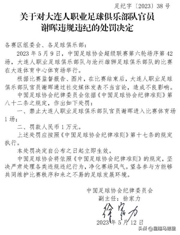 北京时间5月12日,中国足协再次发布罚单,大连人主帅谢晖因为通过社媒发表不当言论,造成不良影响。足协处罚禁止谢晖禁止进入比赛场1场,罚款1万元人民币。