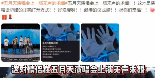 近日,五月天在北京鸟巢举办演唱会,一对情侣在演唱会现场用手上写字的方式上演无声求婚。情侣手掌写下彼此心意,浪漫到了极致!