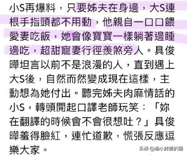 值得一提的是,此前小S就曾透露具俊晔为了宠爱娇妻,甚至就连大S上厕所都会帮忙“把尿”,抱着对方进入厕所,由此看来他是真的很喜欢大S,并不是演出来的。