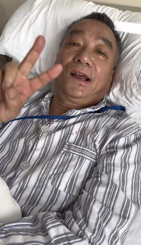 乔爸依然积极乐观,躺在病床上还对着镜头比剪刀手。