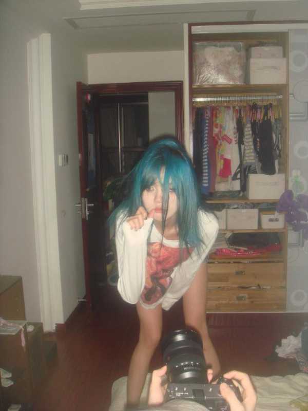 照片中,“井川里予”染着蓝发,身穿黑丝透视装,趴在床上摆出不同动作秀身材。其中一张图片中,还有一双拿着摄像机的手入镜。