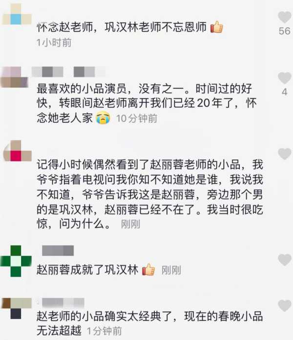 对此网友们评论说:”怀念赵老师,巩汉林不忘恩师。”还有人说赵丽蓉老师是他们最喜爱的演员之一,至今都很难忘记她给大家带来的欢乐。如今赵丽蓉老师逝世20周年,大家都很想念她。