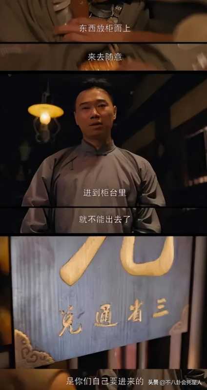 还有当铺里“掌柜和抢劫的人”之间的对话,都值得咱们细细品味,看起来似乎神神叨叨,不知道说了个啥,但细品就知道世道如何,“进到柜台里就不能出去了”,“东西放柜面上,来去随意”,“是你们要进来的”。抢劫的成了被抢的。