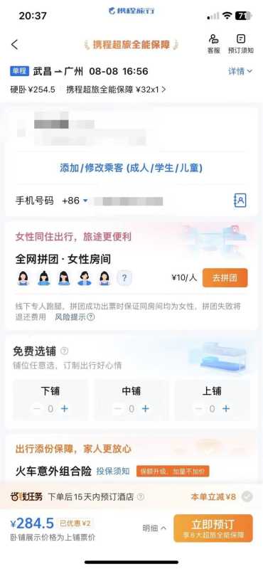 7月25日晚,极目新闻记者通过携程APP,尝试预订8月8日从武昌开往广州的K1079次列车,勾选“硬卧”选项后进入预订页面,在预订页面中,能够明显看到有“全网拼团·女性房间”字样的服务项目,收费标准为10元/人。该服务称:“线下专人跑腿,拼团成功出票时保证同房间均为女性,拼团失败将退还费用”。