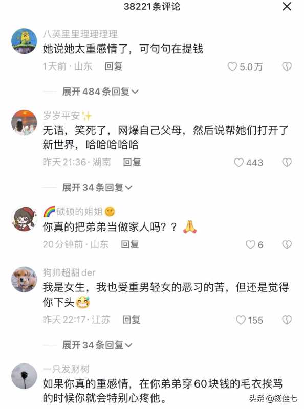更过分的是,她在网上拥有几十万的粉丝,特意将自己的家庭曝光在网络,称自己的弟弟出生就是个意外,母亲流了三次产都没有流掉,所以父母就对弟弟有些许漠视。