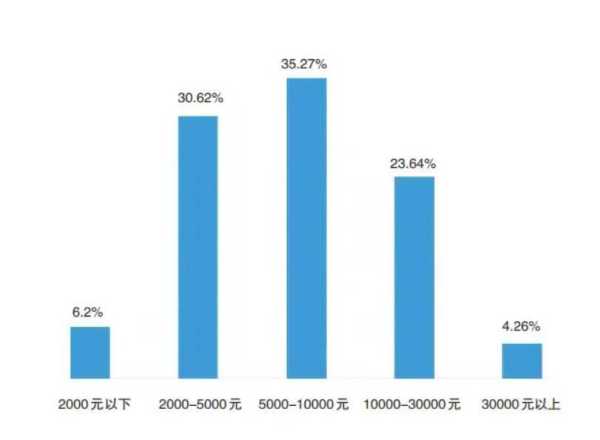在暑期花销调查表上,能够看出消费在5000-10000元的家庭最多,占比了35.27%,剩下的便是花销在2000-5000元和10000-30000元之间,分别占比为30.62%和23.64%,从表中看出,花销数据在2000元到30000元之间,整体跨度非常大。