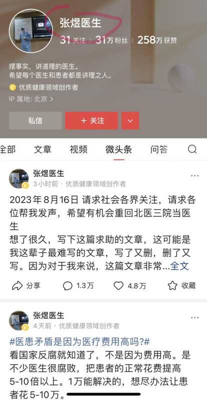 近日,张煜医生的一条帖子映入我眼帘,第一句话就是恳请社会各界人士帮助他发声,他希望重新回到北医三院当医生,那是他一生的梦想,他希望能回到医生的工作岗位上帮助更多人。