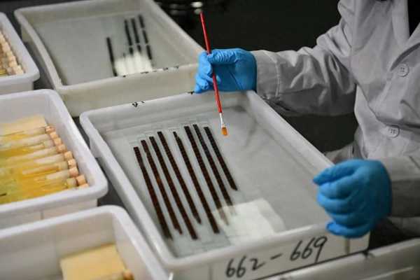 一支支“天回医简”被放置在蒸馏水中,成都文物考古研究院文保中心工作人员在进行清理工作。