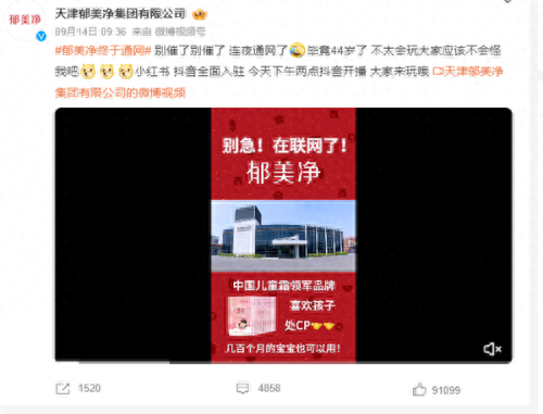 “天津郁美净集团有限公司”官微发文称“别催了别催了,连夜通网了!毕竟44岁了,不太会玩大家应该不会怪我吧!小红书、抖音全面入驻”,同时宣布当天将在抖音开播。