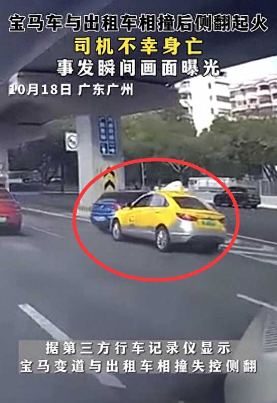10月18日,广州发生了一起严重的交通事故,一辆宝马车与一辆出租车相撞,导致宝马车侧翻起火,整个车身都燃烧了起来,宝马车主当场身亡,现场画面惨烈,也曝光了两车相撞的全过程。