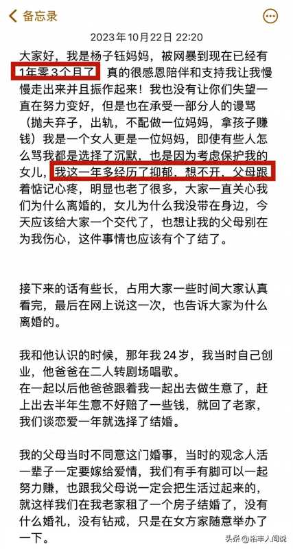 杨子钰妈妈将自己被网曝的时间清晰的写了出来,一年零三个月。这段时间,她为了女儿,承受了所有的伤害,并遭到情绪病的困扰,也曾想不开,父母更是跟着惦记,心疼。