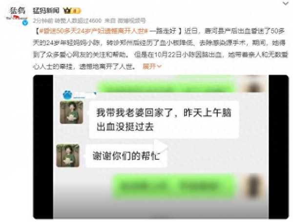近日,唐河县产后出血昏迷了50多天的24岁年轻妈妈小陈,转诊郑州后经历了血小板降低、去除感染源手术,期间,她得到了众多爱心网友的关注和帮助。 但是在10月22日小陈因脑出血,她带着亲人和无数爱心人士的牵挂,遗憾地离开了人世。一路走好,愿天堂里再也没有伤痛!