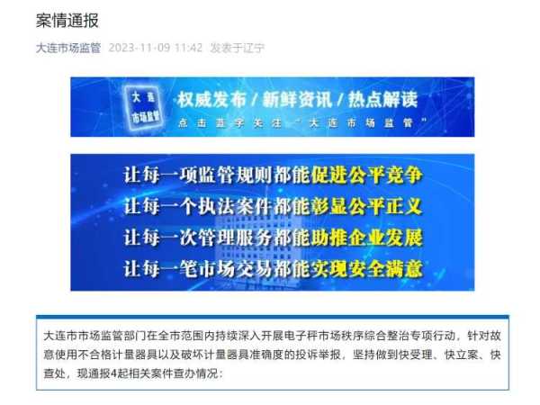 随后,记者在大连市场监管局官方公众号发布的案情通报中了解到,大连市市场监管部门在全市范围内持续深入开展电子秤市场秩序综合整治专项行动,并通报4起相关案件查办情况,将对涉事的4家商户立案调查,依法严处。后续,大连市场监管部门将持续加大明察暗访检查力度,依法依规严厉查处使用以欺骗为目的计量器具等损害消费者合法权益的违法行为,对涉嫌犯罪的将移交司法机关追究刑事责任,进一步营造更加公平有序的市场环境。