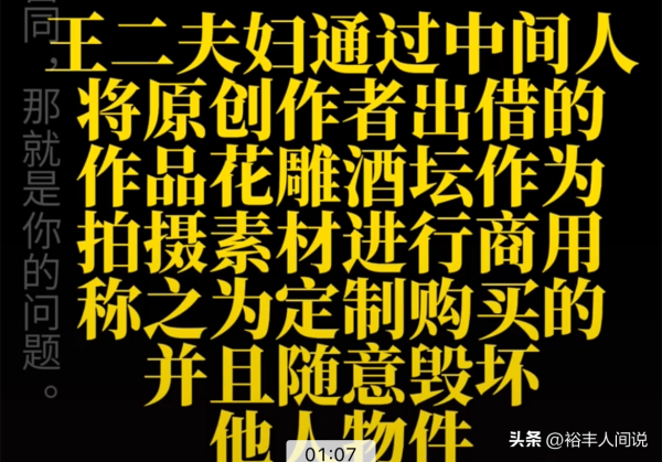 为了营造人设,王又又和男友便开始筹备下一个视频的拍摄。两人通过中间人借了“花雕酒坛”作为拍摄视频的素材,并表示花雕酒坛是定制购买的,这期间还出现了损坏的行为。