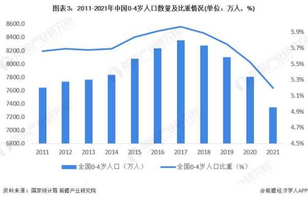 根据中国统计年鉴的数据,2011-2020年,我国的0-4岁人口比重经历了先上升后下降的趋势,婴幼儿人口数量也呈现出这一趋势。2017年,我国0-4岁人口数量为8351.5万人,占总人口比重的6%。随后我国婴幼儿的数量和比重均开始出现下滑。2020年,我国0-4岁人口数量为7801.3万人,较2017年减少约550万人;2020年,我国0-4岁人口占总人口比重则下滑至5.5%,较2017年下降0.5个百分点。2021年,全国0-4岁人口数量继续下降,约为7340.3万人。