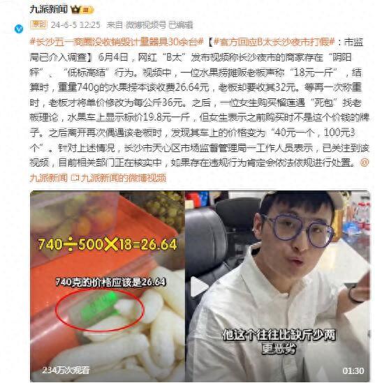 6月4日,网红“B太”发布视频称长沙夜市的商家存在“阴阳秤”、“低标高结”行为。视频中,一位水果捞摊贩老板声称“18元一斤”,结算时,重量740g的水果捞本该收费26.64元,老板却要收其32元。等再一次称重时,老板才将单价修改为每公斤36元。之后,一位女生购买榴莲遇“死包”找老板理论,水果车上显示标价19.8元一斤,但女生表示之前购买时不是这个价钱的牌子。之后离开再次偶遇该老板时,发现其车上的价格变为“40元一个,100元3个”。针对上述情况,长沙市天心区市场监督管理局一工作人员表示,已关注到该视频,目前相关部门正在核实中,如果存在违规行为肯定会依法依规进行处置。