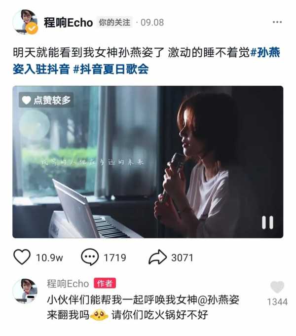 在孙燕姿发布了入驻平台第一天的视频后,程响也第一时间跑到评论区评论,来表达自己对偶像的喜爱和支持。