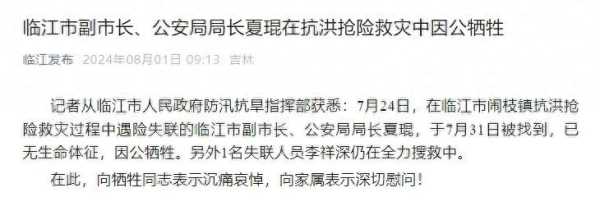 8月1日,据临江发布微信公众号消息,记者从临江市人民政府防汛抗旱指挥部获悉:7月24日,在临江市闹枝镇抗洪抢险救灾过程中遇险失联的临江市副市长、公安局局长夏琨,于7月31日被找到,已无生命体征,因公牺牲。另外1名失联人员李祥深仍在全力搜救中。